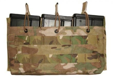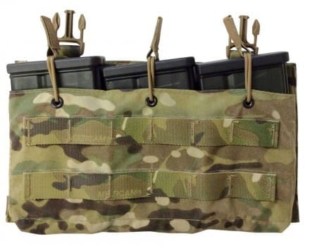 The HK417 Triple Mag Pouch, Open Top holds three HK417 20 round magazines with an adjustable shock cord retention system. At the front of the pouch are two rows of MOLLE webbing to attach additional pouches.