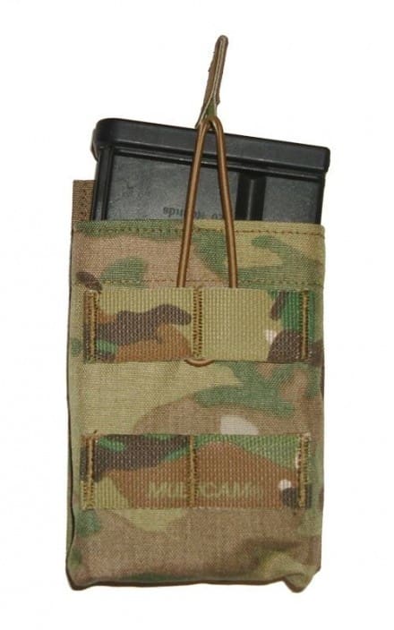 The HK417 Single Mag Pouch, Open Top incorporates an adjustable shock cord retention system. The front of the pouch has two rows of MOLLE webbing to attach additional pouches.