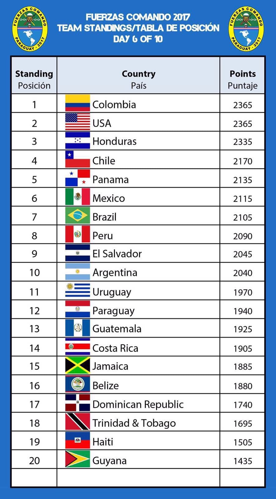 Team USA and Colombia are tied for first place in the CT Competition. There are 3 events left (Team week PT event, Obstacle curse and the ruck march).