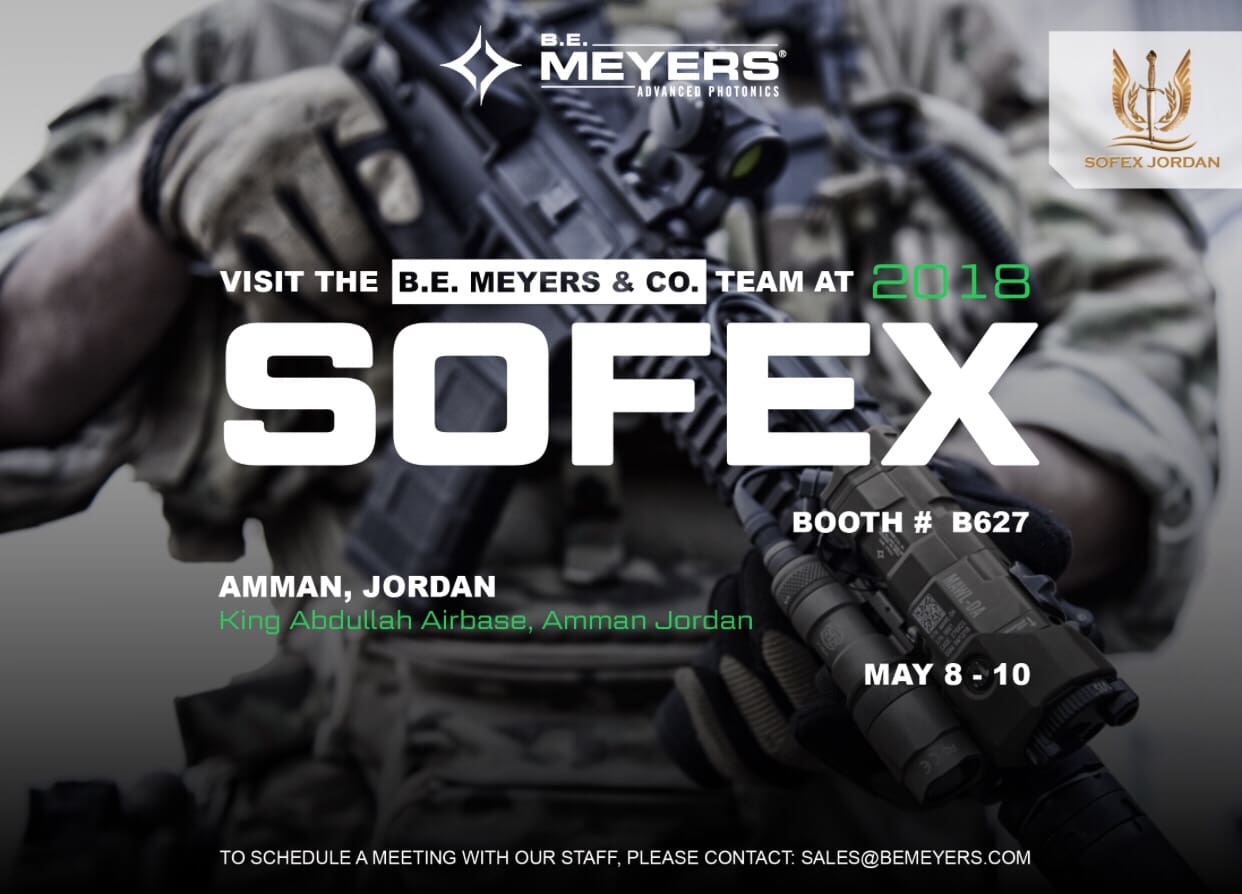 May 3, 2018 (Redmond, WA, USA) – B.E. Meyers & Co., Inc. will be showcasing advanced global defense and security solutions at the Special Operations Forces Exhibition and Conference (SOFEX) in Amman, Jordan on May 8-10, 2018. Attendees are invited to visit B.E. Meyers & Co. in the USA Security Defense Pavilion at booth #B627 where they will be exhibiting the MAWL-DA infrared and visible green weapon laser pointer/illuminator; the GLARE series of weapon mounted Hail/Warning/Illumination laser systems; the BOARS-M2 optics and accessories rail for the M2 platform; and the IZLID series of IR and SWIR laser pointers/illuminators for target marking and air-to-ground integration.