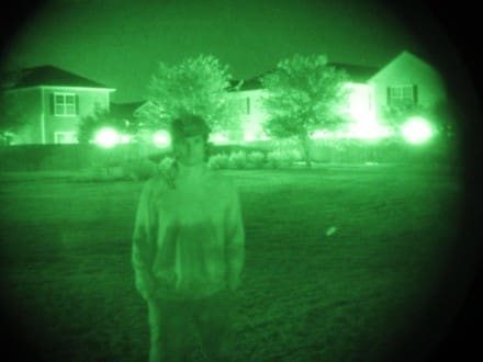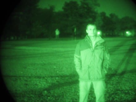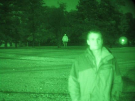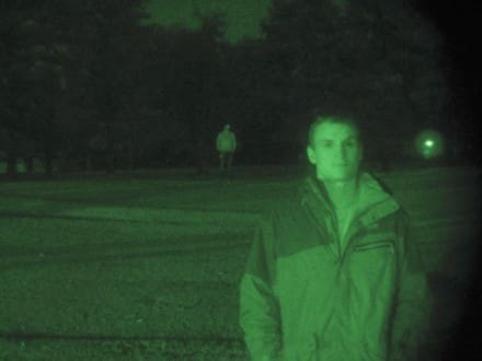 Rural area that had some background lights, but no direct lighting. Picture 1 we focused the goggles to the person in the distance. In picture 2 we focused the goggles on near person. Picture 3 we focused back on the person in the distance and then started to engage the Tarsier Eclipse, which allowed both objects to remain in focus for the current lighting conditions.