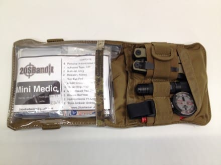 In addition to the Mini Kit MK-7, we are offering the optional Mini Medic pouch, designed by 20$Bandit to fit in the clear plastic pocket of the Mini Kit MK-7. It comes in watertight re-sealable bag from Loksak and contains a comprehensive “bobo” style first aid kit. This is a great add-on for those that want to outfit their Mini Kit with a robust first aid kit right out of the box. The Mini Medic kit comes complete with Personal Anti-Microbial wipes x 4, one roll of .5″ adhesive tape, Burn Jel 3.5 g x 2, Moleskin x 2, Oval Eye Pad, Wound Closure Strips .25″ by 4″, Sheer Strips 1″ by 3″ x 10, Sterile Gauze Pad 3″ by 3″ x 4, Knuckle Bandages x 5, Hydrocortizone 1% Creme 1.5 g x 2, Mylar Space Blanket, and Triple Antibiotic Ointment, .9 g x 2.