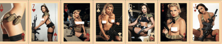 Our man in Manchester stood in line clutching the calendar. Once he made it to the head of the line (and was able to untie his tongue to ask for their help) he secured the signatures of all six calendar models. This year’s Hot Shots calendar is inspired by pinups of the 40s and 50s and they’ve done a bang up job on the bawdy playing cards as well (see the sampling below). And, as always, 50% of proceeds go to military charities.
