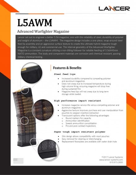 Applying their expertise in advanced polymers and lightweight component design, Lancer has created the L5 and L7 Advanced Warfighter Magazines (AWM).