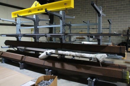 Steel rods which will eventually be processed into barrel blanks. The yellow crane above is slated to be installed to a movement system which will simplify the process of moving the steel.