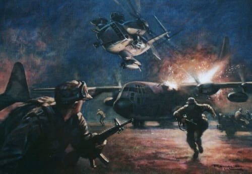 This painting adorns many a man’s wall who was present that night. It depicts the activity at Desert One before the accident. I have had the privilege of meeting many of those involved in this complex operation and they are some of the greatest Americans I know.