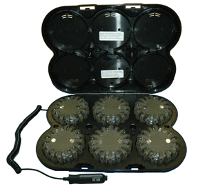Shells are available in Yellow, Orange, Blue, and OD. LEDs are offered in Amber, Blue, Green, Red, and White. Additionally, a special version of the PowerFlare is available with IR LEDs. The best value is the PF-200R 6-Pack Rechargeable System which comes with six of the PF-200R beacons packed in a recharging case. The recharger can be plugged into a vehicle hot point (12-30VDC) or wall outlet.