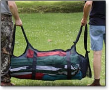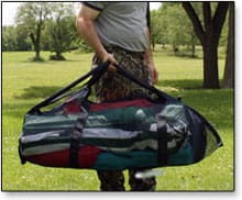 The Netcessity allows you to carry odd loads in a number of configurations. To load the bag just lay your gear in the center of the open bag. Then you gather the four sewn straps and secure them at the base using the bungee closures.