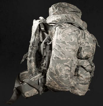 An internal hydration pocket holds a 100 oz reservoir. The lid is elasticized to provide a weatherproof closure and a storm skirt enhances weatherproofing and provides increased capacity for large loads. There are slot pockets for skis or mortar tube The pack features attachment points for ALICE clips and pockets and there is a velcro strip for name tag and cat eyes. There are also three grab handles as well as compression straps.