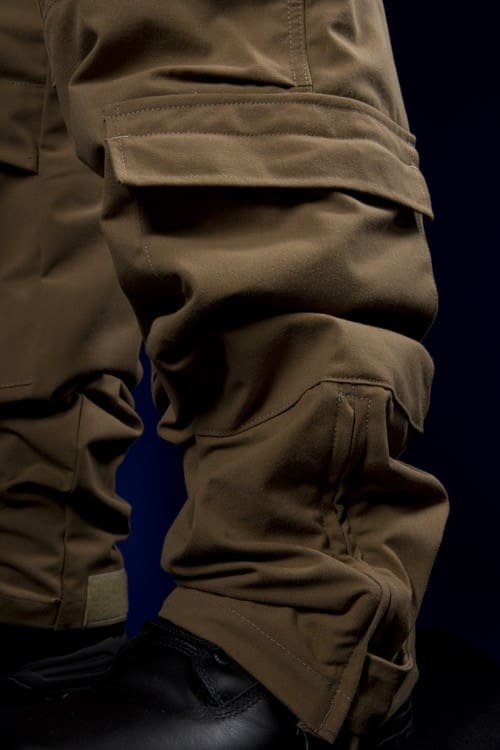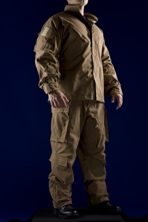 The jacket incorporates the most useful features of the Army Aircrew Combat Uniform (A2CU) but is streamlined and omits the more frivolous items such as ports for the micro climate cooling system. The trousers also have incorporated features from the A2CU such as zippered pocket access and knife pouch along the inner thigh but this latter feature has been a mainstay of flight suits for over 50 years.