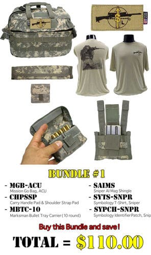 For example, Bundle #1 includes a Mission Go Bag, Carry Handle Pad, Sniper Mag Shingle, as well as Sniper T-shirt and Symbology Patch.