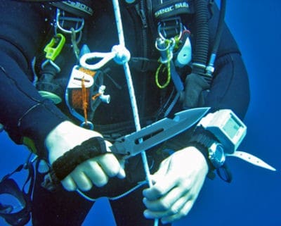The knife’s blade includes a specialized net and line cutting system for use in entanglement emergencies. The knife is designed with reduced hilt guards to reduce the chance of entanglement and snaring while in use and the pointed tang was developed as a glass break device. Additionally, besides being a good all around camp knife, the Ultramarine was designed so the handle could be disassembled, the blade attached to a pole, and used as a spear. The blade also features a matte finish to reduce light reflection wile operating in hostile environments.