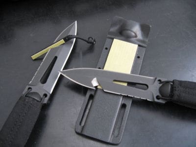 The dive sheath is a work of art and is designed to be sleek and hydrodynamic, with a close, tight fit to the body to reduce the risk of entanglements. The sheath also has a quick-release function that allows the knife to be rapidly drawn by simply pulling on the upper portion of the protective flap. The O-ring and retention system are disabled with a strong pull so in a panic or shock situation the user will have access to the knife. The protective flap uses special anti-wet snap fasteners designed for water environments. Finally, the sheath incorporates two sharpening diamond sharpening plates; one for the primary blade and the second for the net cutter.