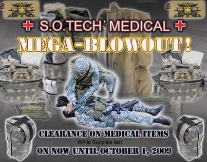 S.O. Tech is holding a sale on medical equipment from now until 1 October. In addition to several bags that can be used as medical kits like the Mission Go Bag and Go Bag as well as the General Purpose Pouch and Slim Individual Medical Aid Pouch, S.O. Tech is featuring discounts on a large inventory of combat medical/first aid supplies like the Celox products (Celox Gauze, Celox Granules 35g, Celox Granules 15g), Sodium Chloride 50mL IV bags, Trauma shears, SOF tourniquets, Z-pack Dressings, and more.
