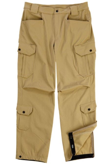 With a slim athletic cut, these pants are designed to look great, as well as perform. The four-way stretch nylon/spandex blend moves with the wearer and stretches with every motion yet protects against wind, water, and abrasion. The high memory ensures that the pant keeps its shape even after being used and abused. The crotch gusset and articulated knees enhance the mobility without adding extra seaming or bulk and the belt loops were designed to avoid getting snagged. The pants feature four cargo pockets, two on the thigh sides and two on the calf sides. Additionally, knife pockets are sewn onto both thigh cargo pockets for easy access to a blade and staggered Velcro on those pockets aids the user so that the whole pocket doesn’t have to open to get the knife. The pockets can be stuffed to the brim and the Velcro can still attach, or the pockets can carry a lighter load and be snapped shut for security. The angle on the thigh pockets rolls the stored goods forward so they are always where your hand is hanging. Zippered hems allow ease in pulling the pant on over boots, and gripper tape at the hem keeps the pants down around the ankle where they should be. A final touch is the addition of grommets to the hems so that they can be strapped down over boots.