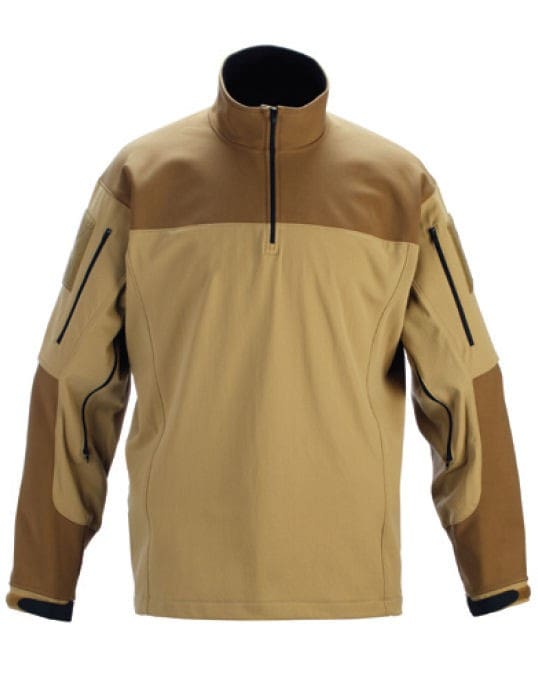 Designed to be worn under armor, the Lightweight Softshell Pullover is made from a combination of a 4 way stretch nylon/spandex bonded to a hydrophobic fleece, and a 4 way stretch nylon/spandex twill fabric. The softshell fleece fabric is used on the collar, yoke, and upper sleeves, wrapping around the cuff to protect the wrist. The softshell twill is used for the body and under sleeves, reducing bulk and friction. The cuff is finished with the thinner twill, creating a flat, snug band that keeps the wind out without restricting the wrist. A quarter-zip at the neck creates an opening wide enough to pull over the end, while keeping the zipper end above the top of the armor package. A longer body gives the wearer the opportunity to tuck the shirt into the pants, reducing any chance for it to get snagged, but the dropped tail will protect the rear even if the shirt gets pulled out. Bicep pockets on the sleeves provide easy to access storage, with Velcro patches for any badges. Pit zips under the arm provide optional ventilation, but also allow for the sleeves to be converted into short sleeves, with pockets under the bicep to roll excess fabric into. Such a capability was specified by the customer due to the danger of overheating during movement to contact or while in the assault.