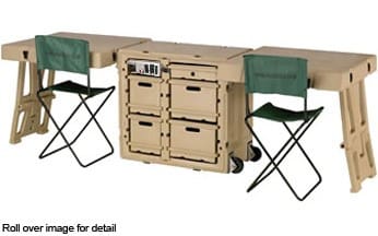 The shipping weight empty is 100 pounds but features two heavy duty wheels to make it easier to move around. The Tactical Officeâ„¢ also includes field chairs that can be folded and stored in the lids and unlike that stool that came with your old WW II-style GI field desk, these have chair backs.