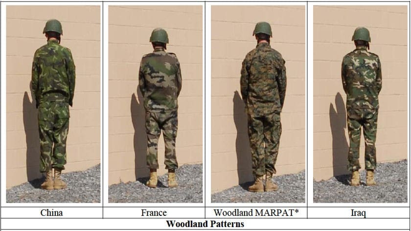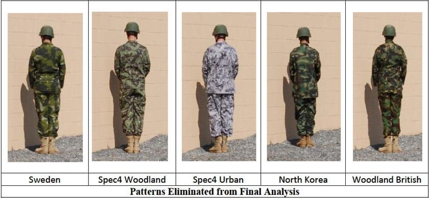 “Although detection data were collected on 18 patterns, five patterns (i.e., Sweden, Spec4 Woodland, Spec4 Urban, North Korea, and Woodland British) were eliminated from the final data analysis. The two Spec4 patterns were not available for desert image collection; therefore, they did not have a complete data set. Sweden, North Korea and Woodland British were eliminated, due to being the worst performers in two out of the three environments. Their similarity to other woodland patterns was further justification, although it must be noted that detection data are available for further analysis, if desired.”