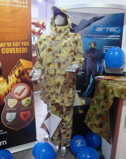Australian firm Global Safety Solutions & Management PTY LTD exhibited their new wet weather laminate material. It is used in the current Australian issue foul weather clothing system.