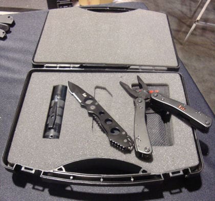 Benchmade Knives showed a set of their HK signature knives packed inside a pistol case. The combo pack includes a 20-Tools-in-One mutli-tool, LED light, and Ally knife.