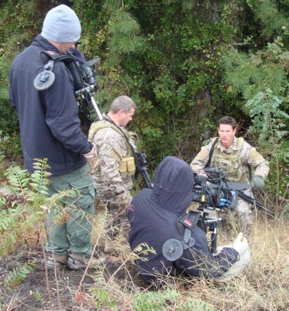 While I was there they were filming an intro sequence that will be featured on an episode of “Tactical Impact” focused on Special Forces. As the cast and crews are the same for both shows, segments are shot in overlapping schedules. Very little of the work is conducted indoors so it can lead to some long days in weather extremes from the North Carolina heat to cold rainy days that hover just above freezing. Cold and wet describes my time on set perfectly.