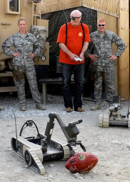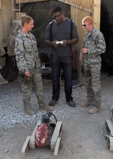 Fox NFL Sunday’s” Terry Bradshaw and Michael Strahan spent some time USAF EOD techs Staff Sgt. Elizabeth Spradley and Senior Airman James Dobrynski on a recent visit to Bagram Air Base in Afghanistan. They got some stick time with the iRobot EOD robot and checked out the Vuzix TAC-EYE.