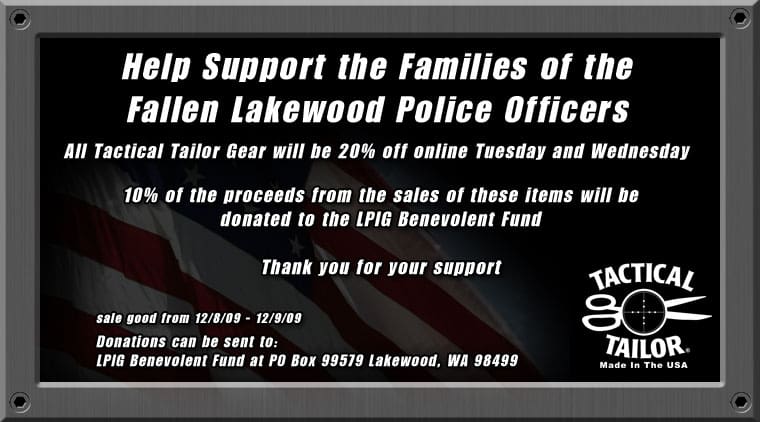 In an effort to help support the families of four fallen Law Enforcement Officers, Tactical Tailor will be hosting a two day online sale where 10% of the proceeds will be donated to the Lakewood Police Independent Guild Benevolent Fund.