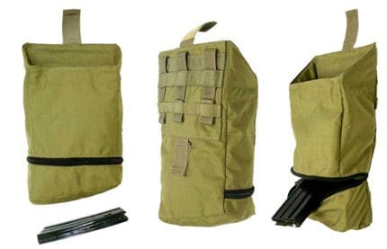 Two variants are available. A standard model and the zippered version (shown). The unique designed is intended to ensure magazines lay flat in the pouch. The zippered version is designed to assist in extracting magazines from the pouch. The opening features a removable elastic opening to quickly reconfigure the pouch’s use as its deep design offers ample room for magazines or for use as a Sensitive Site Exploitation bag. Additionally, it rolls up and out of the way when not in use yet the top is reinforced with stiffeners to keep its shape.