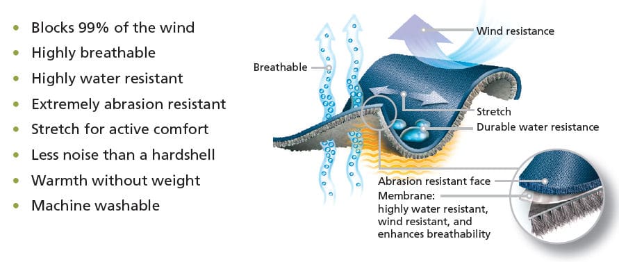 Polartec Power Shield Pro is a laminate that can offer a combination of poly or nylon woven face fabrics with excellent DWR and durability characteristics, paired with lightweight to high loft backs. Sandwiched in between is a proprietary new hydrophobic, microporous polyurethane membrane that allows actual airflow through the entire fabric package but stops water from penetrating.