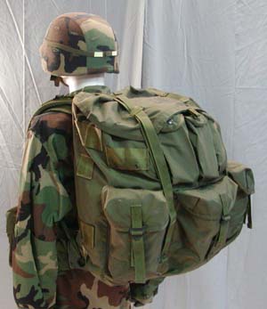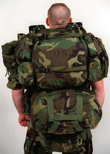 As you can see from this photo (actually an early medical version issued to Navy Corpsman supporting the Marines), the original pack was much smaller but fell in line with the modularity of the overall system. It could be used in conjunction with a variety of additional options including the side mounted sustainment pouches as well as the sleeping bag carrier. Later, with the advent of the Ranger variant of MOLLE a waist pack was added to the mix. When MOLLE was initially envisioned the concept was to provide a variety of modules that the user could add or subtract in order to mission tailor the load. There was concern about devloping a pack that could overload the wearer.