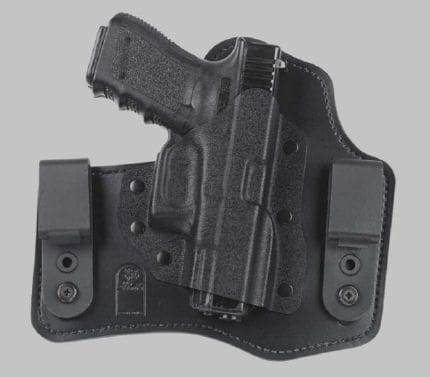 Adjustable for height as well as cant, the Intruder is tuckable and rides against the body on a full grain leather panel. The pistol is held secure in a molded Kydex sheath. The Intruder is currently offered for the Glock and Smith & Wesson pistols. It will accommodate Glock models 17/19/22/23/26/27 and M&P 9mm/.40 and Compact 9mm/.40.