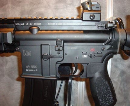At SHOT Show H&K displayed the MR 556 and MR 762 civilian variants of the HK-416 and 417. That they have new names this year is step toward demonstrating that these are not clones of the rifles released in Europe. As we posted in November, the takedown pins are in the same location as Mil Std US Stoner-style rifles. However, take a look at the close up of the takedown pins. They appear smaller in diameter than Mil Std pins, but I was assured by an engineer from Obendorf that this is not the case. What is different about these pins is that the center must be depressed with a punch or similar item in order to be moved. This is required when breaking the weapon down as well as when putting it back together. Interestingly, the MR 762 did not have the new takedown pins (UPDATE: because these are the same samples exhibited last year). Pricing was still not nailed down and discussions of release dates were met with “four months.”