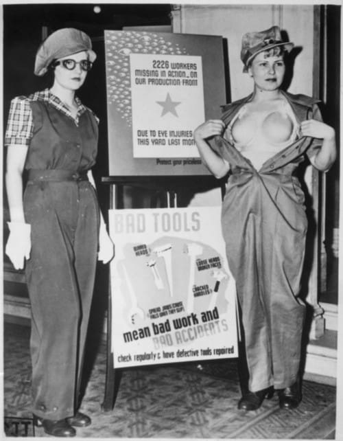 During World War II the American work force dramatically transformed, bringing large numbers of of women into factory and other jobs traditionally filled by men. One of the innovations of the age was a ‘safety bra’ designed to keep the ladies in the fight or at least their part of it. With the recent developments coming out of Europe to develop specialized clothing for women, I thought it would be appropriate to show that we have been doing this here in America for quite a long time even if it probably wasn’t the best idea.