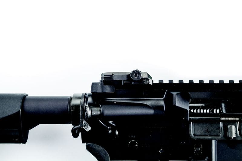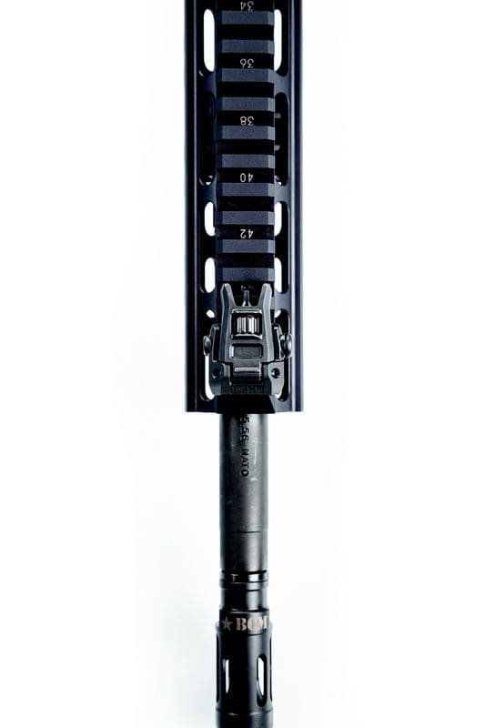 The Rear Sight is .375″ above the rail when stowed and extends to full AR height when in use.