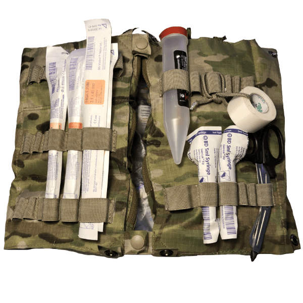 This is the new Drug Roll from MATBOCK. Made from their Ghost and Ghost Lite materials, it features 5 small pouches on the sides and 1 large main pouch in the middle. The large main pouch has their new organizational system integrated into it for all different sizes of medications. Simply push the head of the bottle into the holes and rotate till the drug label can be seen clearly for quick identification during both emergency situations and inventory. When the pouch is closed up, the outside has a few rows of elastic loops for syringes, needles, scissors, sharps containers and other medical necessities. The back is lined with hook Velcro to attach to the inside of medical packs