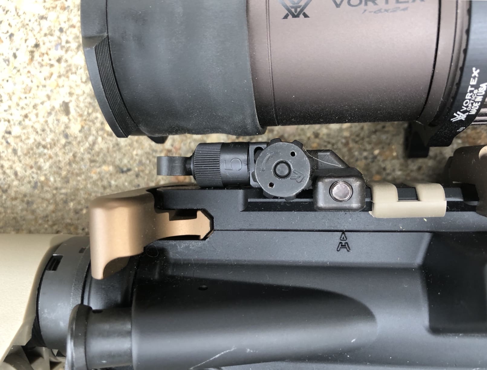Primarily, the SOCOM contract Vortex Razor HD GEN II 1-6x24mm w/ MRAD reticle and zero stops cradled in a purpose built SOPMOD Geissele Mount and topped with a Reptilia ROF 90 Mount w/RMR.