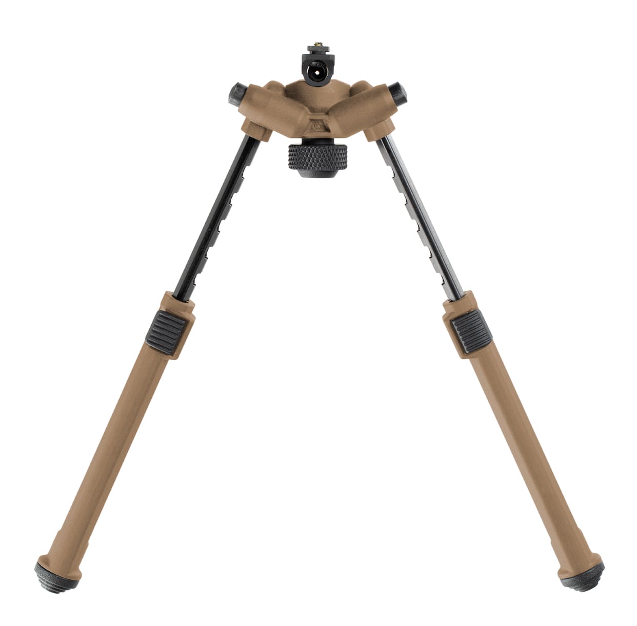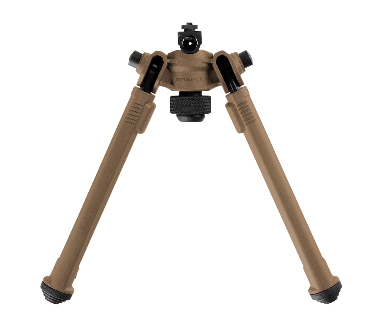 Manufactured from Mil-spec hard anodized 6061 T-6 aluminum and injection-molded polymer, the design is optimized for rapid one-handed adjustments thanks to spring-tensioned legs which stow neatly forward and snap down and lock into place with one hand. Leg extensions slide and lock securely with the push of a button on any of the seven half-inch spaced locking detents. The legs extend a full four inches, from 6.3” to 10.3”. An industry-exclusive 50° of total tilt and 40° of total pan are controlled by a glove-friendly knurled tool-less bipod locking knob located between the extended legs, allowing easy adjustment between shots. Additionally, the Magpul Bipod has the exclusive ability to lock pan at 0° while maintaining full tilt functionality.