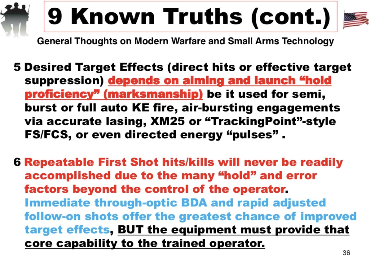 5 Desired Target Effects (direct hits or effective target suppression) depends on aiming and launch “hold proficiency” (marksmanship) be it used for semi, burst or full auto KE fire, air-bursting engagements via accurate lasing, XM25 or “TrackingPoint”-style FS/FCS, or even directed energy “pulses”.