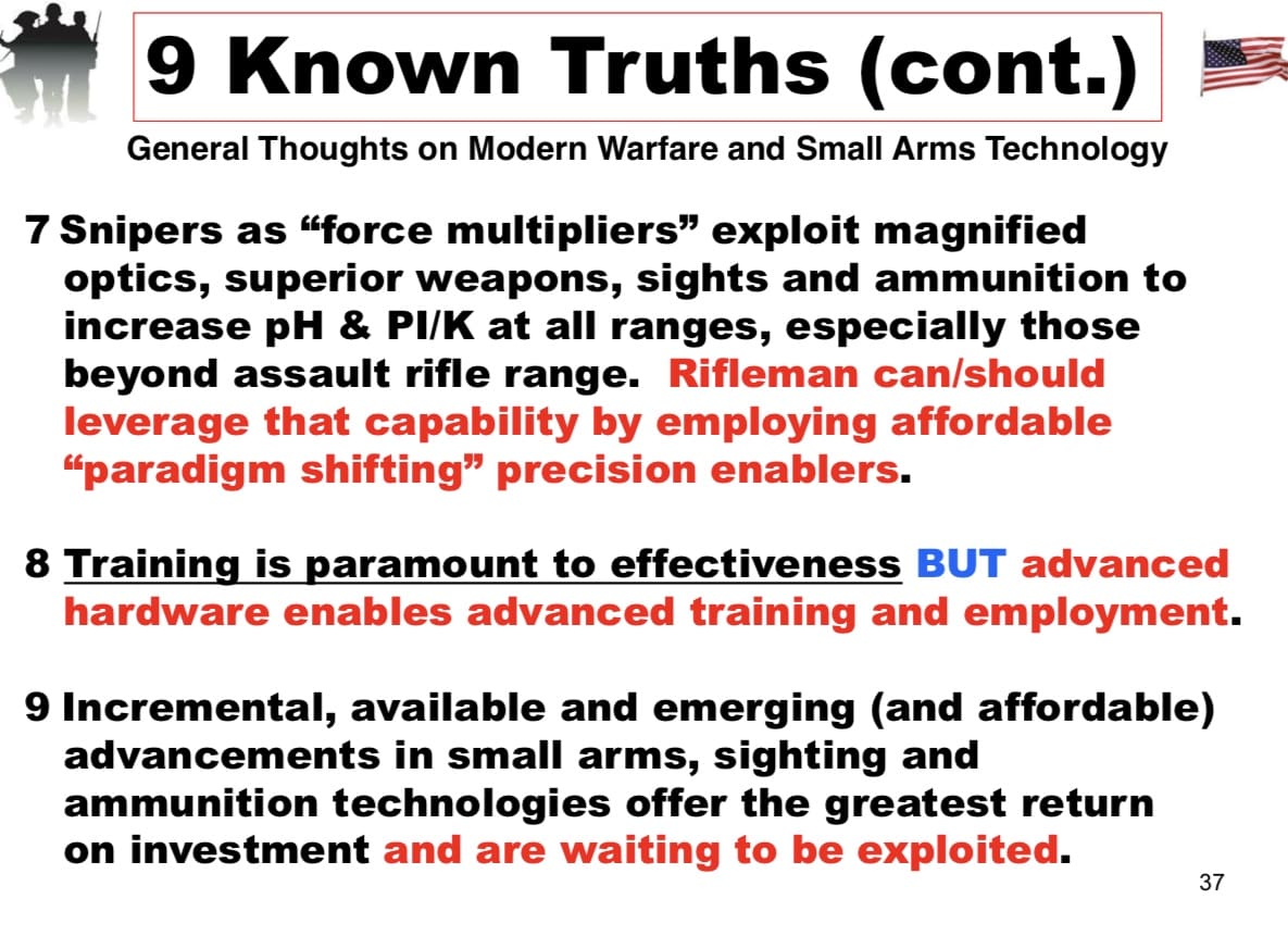 7 Snipers as “force multipliers” exploit magnified optics, superior weapons, sights and ammunition to increase pH & PI/K at all ranges, especially those beyond assault rifle range. Rifleman can/should leverage that capability by employing affordable “paradigm shifting” precision enablers.