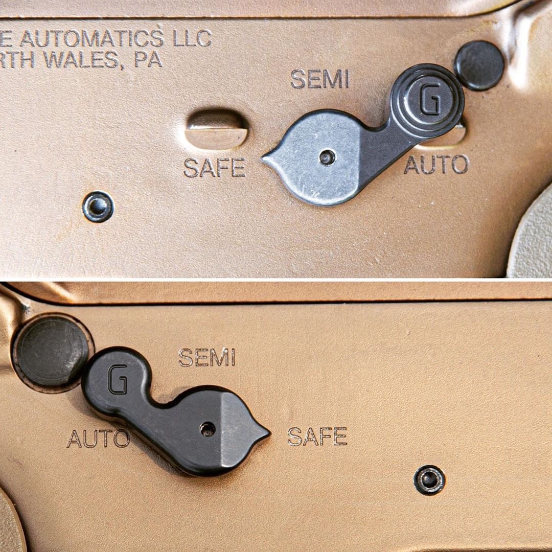 This is Geissele’s new Super Configurable Safety with Dog-Leg Levers. A left handed version is right around the corner.