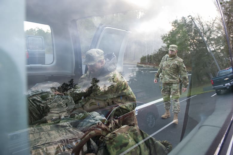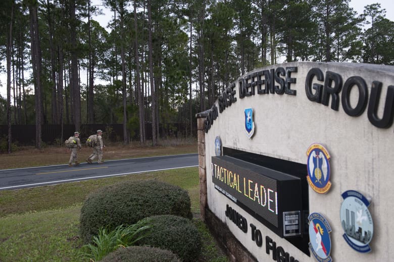 Airmen assigned to the 820th Base Defense Group perform a ruck march Feb. 21, 2020, at Moody Air Force Base, Georgia. Members of the 105th Base Defense Squadron from Stewart Air National Guard Base, New York, and 820th BDG participate in a ruck march as part of the Initial Qualification Training for Base Defense Group Airmen to ensure readiness in a deployed environment. Ruck marches allow Airmen to understand the feeling of carrying mission essential items to better pace themselves and stay fit.