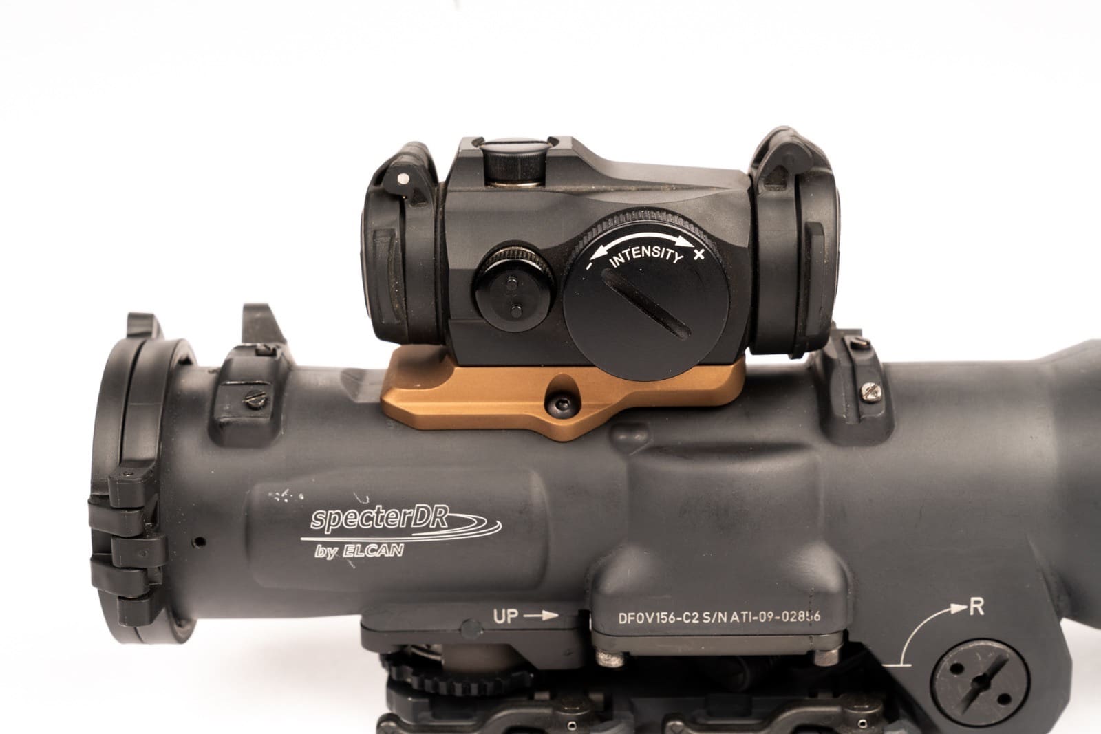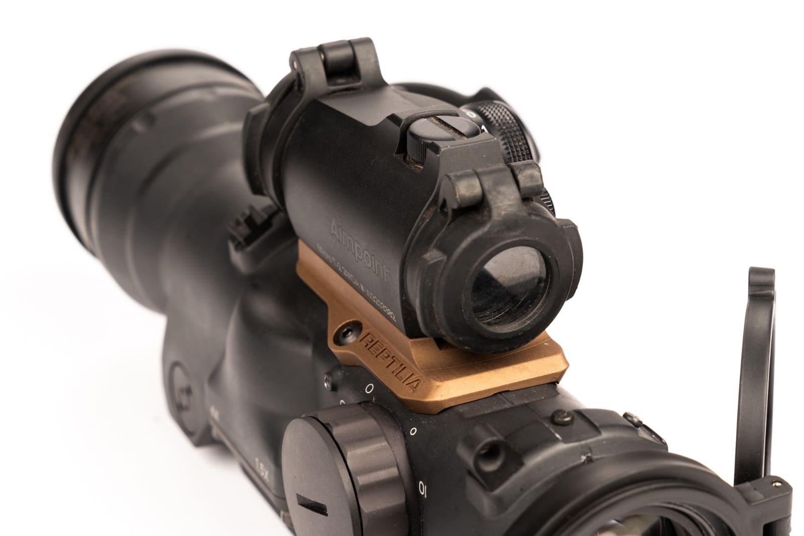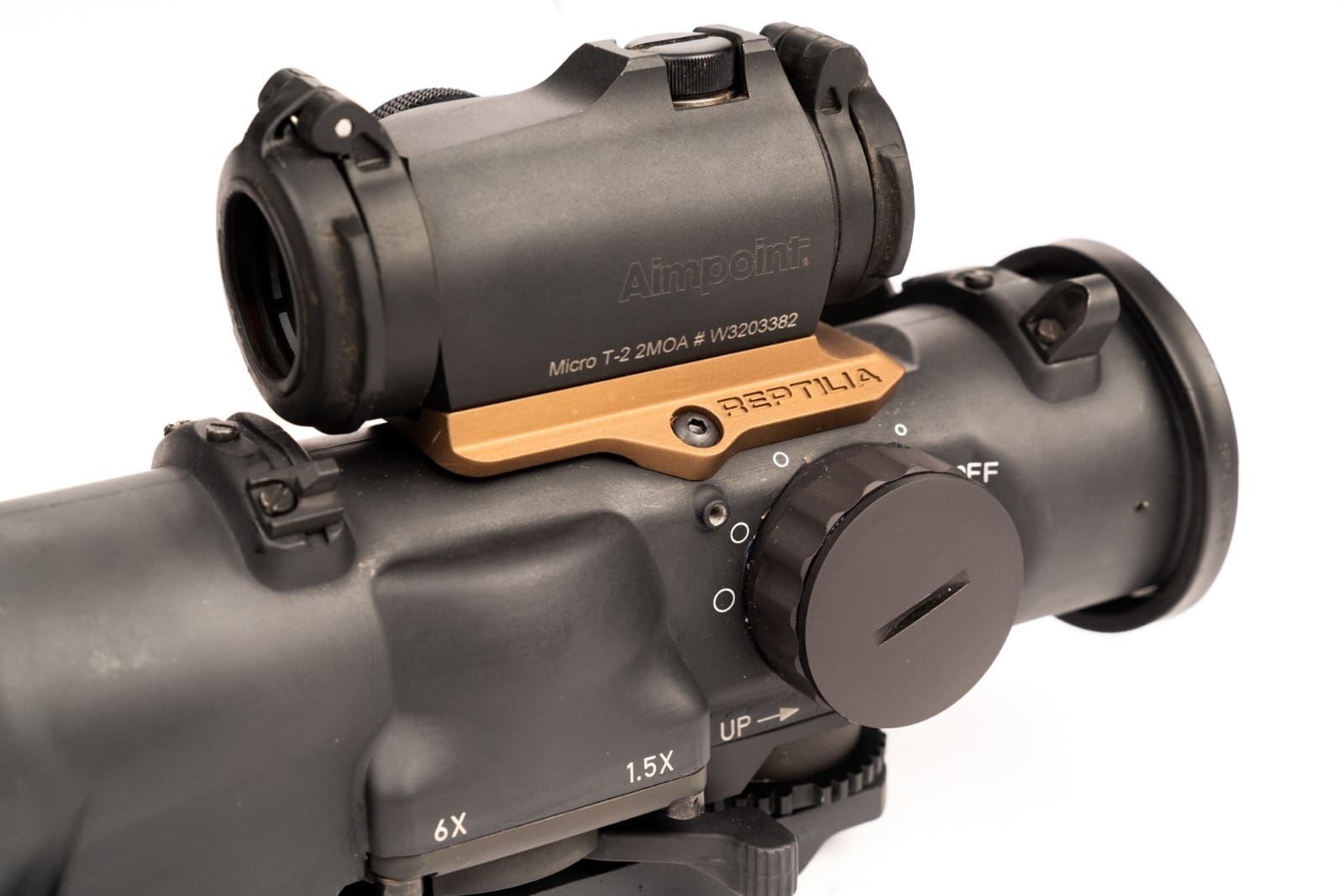 Introducing the Saddle Mount by Reptilia. Designed at the request of a U.S. military customer seeking a more durable miniature red dot solution for machine gun applications, the Saddle Mount allows attachment of Aimpoint® Micro T-1/T-2 and CompM5™ optics to the Elcan® SpecterDR 1.5-6x and 1-4x Optical Sights. The Saddle Mount has been tested and validated by a 3rd party for use on the Mk 17 SCAR, M240, and Mk 48 machine guns, and is now shipping to the DoD via the Tailored Logistics Support Program (TLS-SOE).