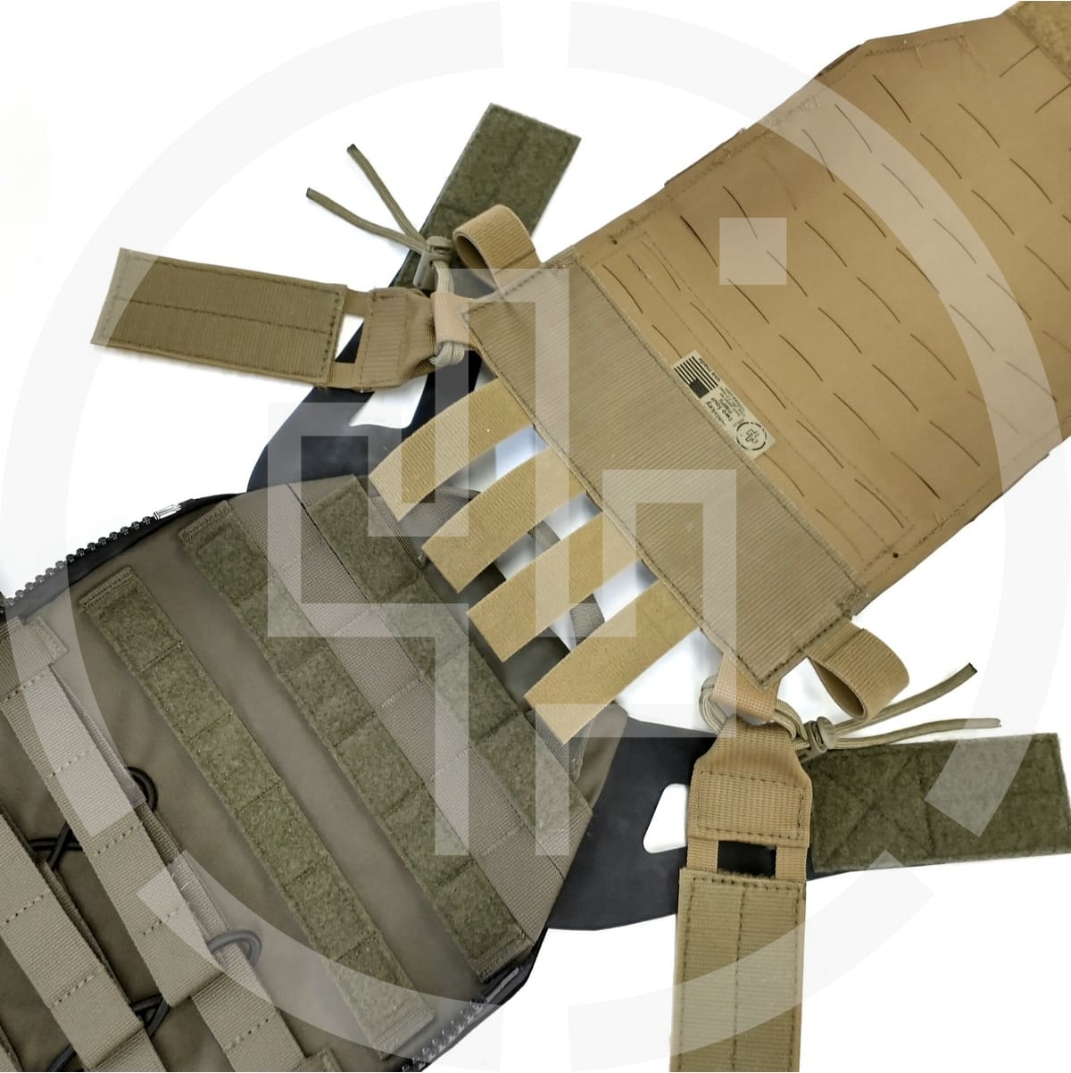 Back Panel 64 uses milspec elastic and VELCRO® Brand ONE-WRAP® loops for hydro and cable routing. YKK heavy duty zipper pull tabs tuck securely and silently into milspec elastic loops at the base. A combo laser cut PALS/loop field accepts ID, IFF, patches, etc. Rather than depending on a stiffener, we opted to connect Back Panel 64’s corners to the Crye JPC 2.0’s shoulder straps to minimize saggy sag and floppy flop tendencies. Connectors are skeletonized so as to not interfere with factory features. Back Panel 64 has laser cut PALS throughout for maximum flexibility. JPC 2.0’s drag handle is still accessible after adding Back Panel 64.