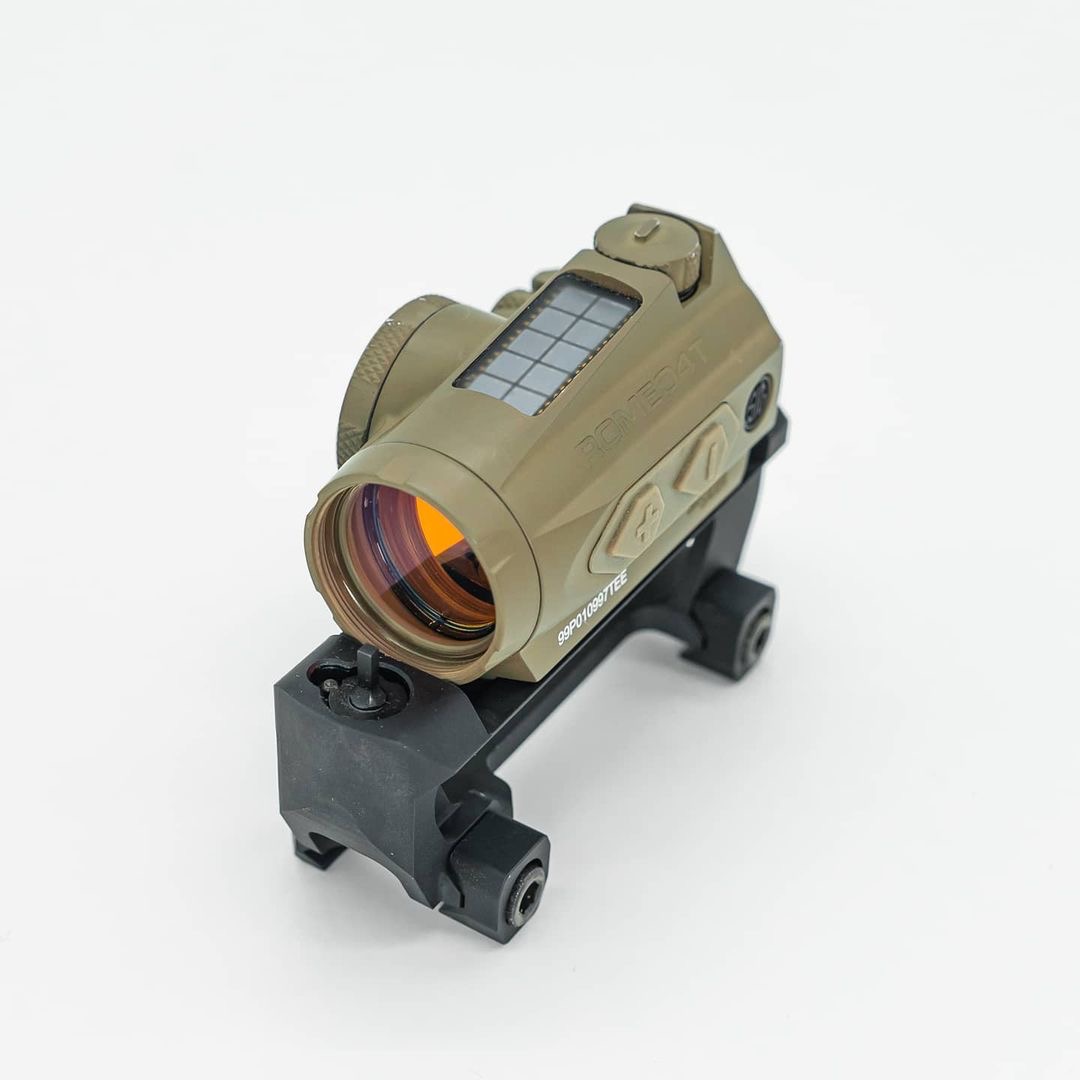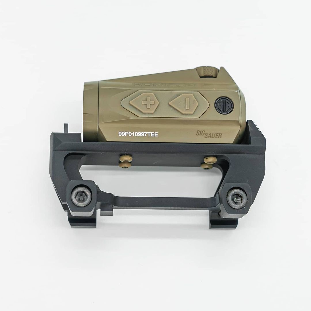 The ANVL UKON V2 mount for the SIG ROMEO4T red dot optic incorporates a single focal plane absolute co-witness backup iron sight. The integrated rear sight is paired with a standard type AR-15 adjustable front sight post.