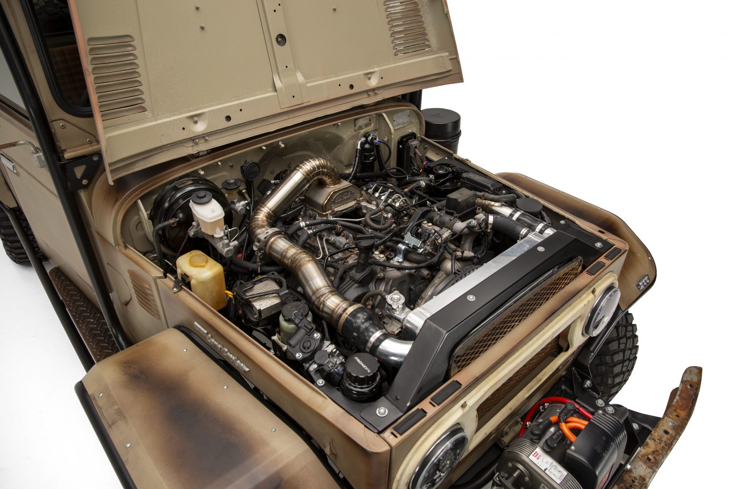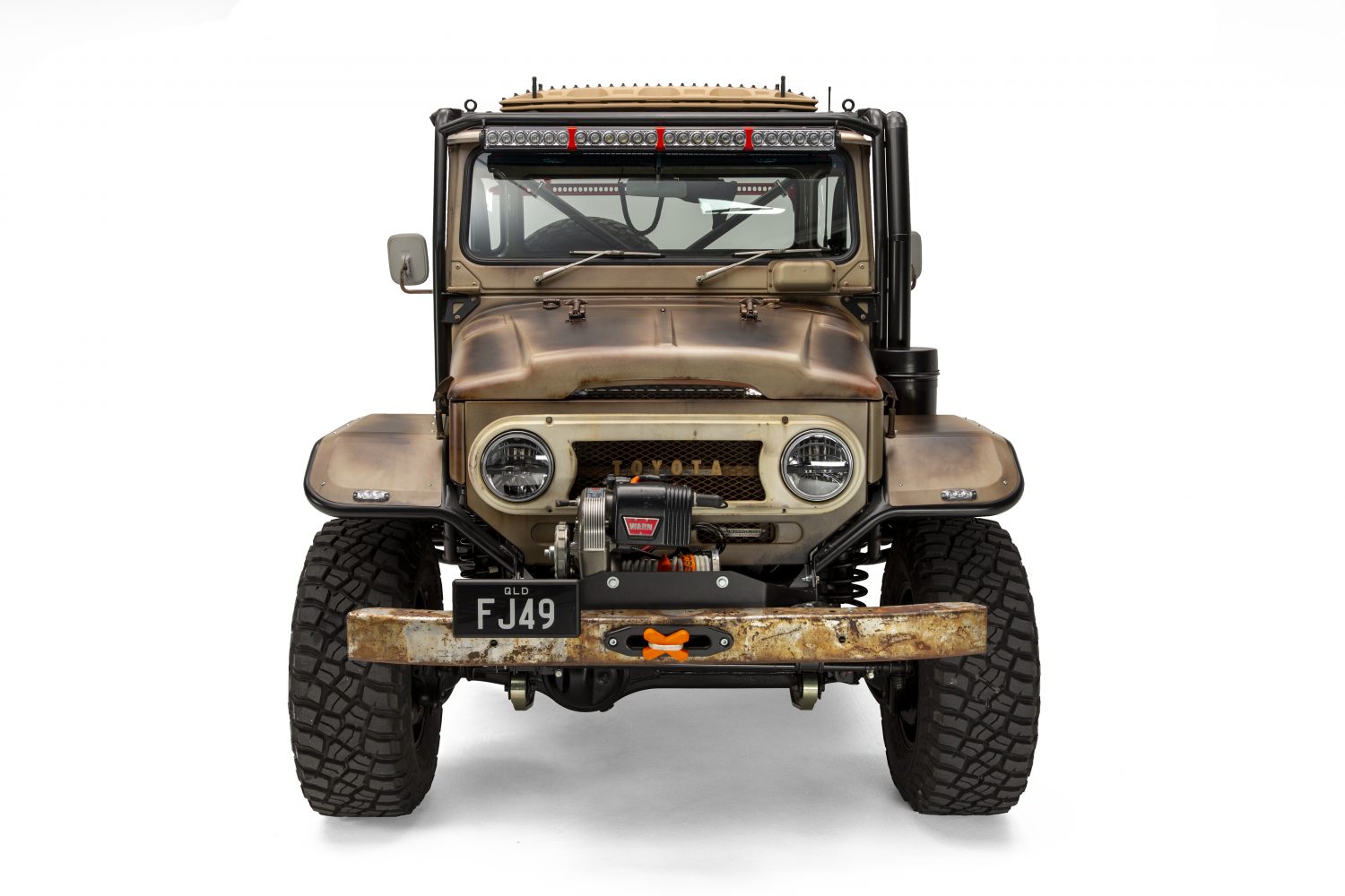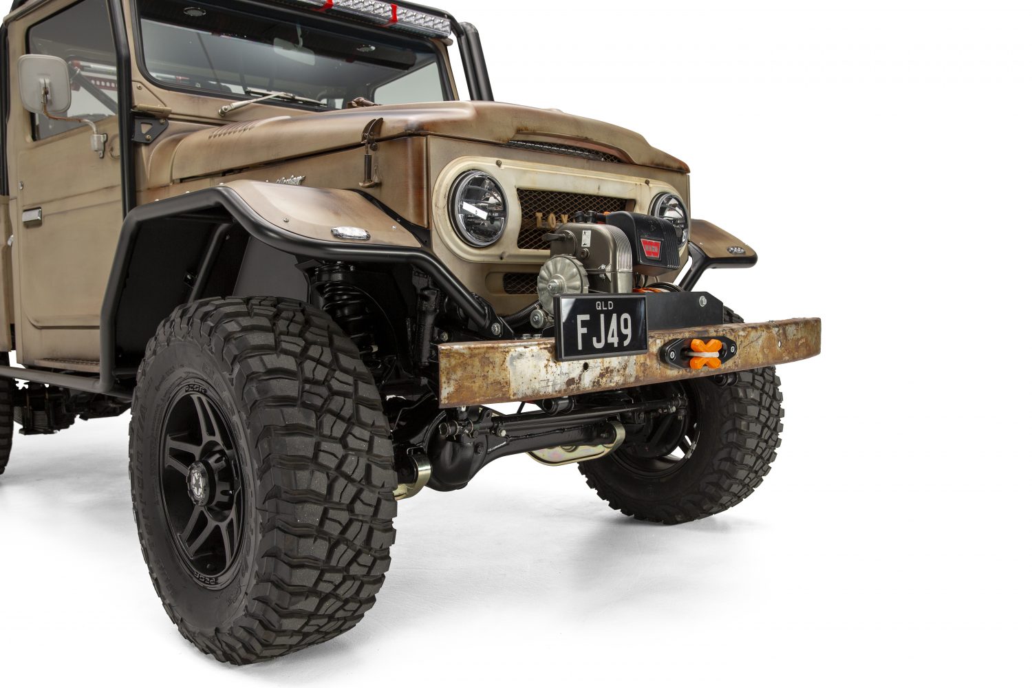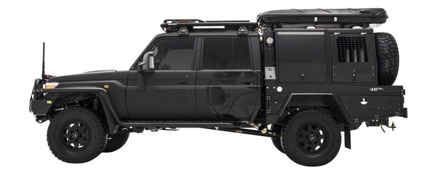 Other accessories include X-Ray Vision dual row LED lightbars, a hoop-less slimline body-colored bull bar, twin angle-mounted spare tire carriers, front and rear TJM winches, two 240-liter Brown Davis replacement fuel tanks with auxiliary fuel distribution switch and pre-fuel filter kit, twin air-outlets to manage tire pressures, a 70L water tank and a lockable mini canopy with a 60-liter refrigerator.