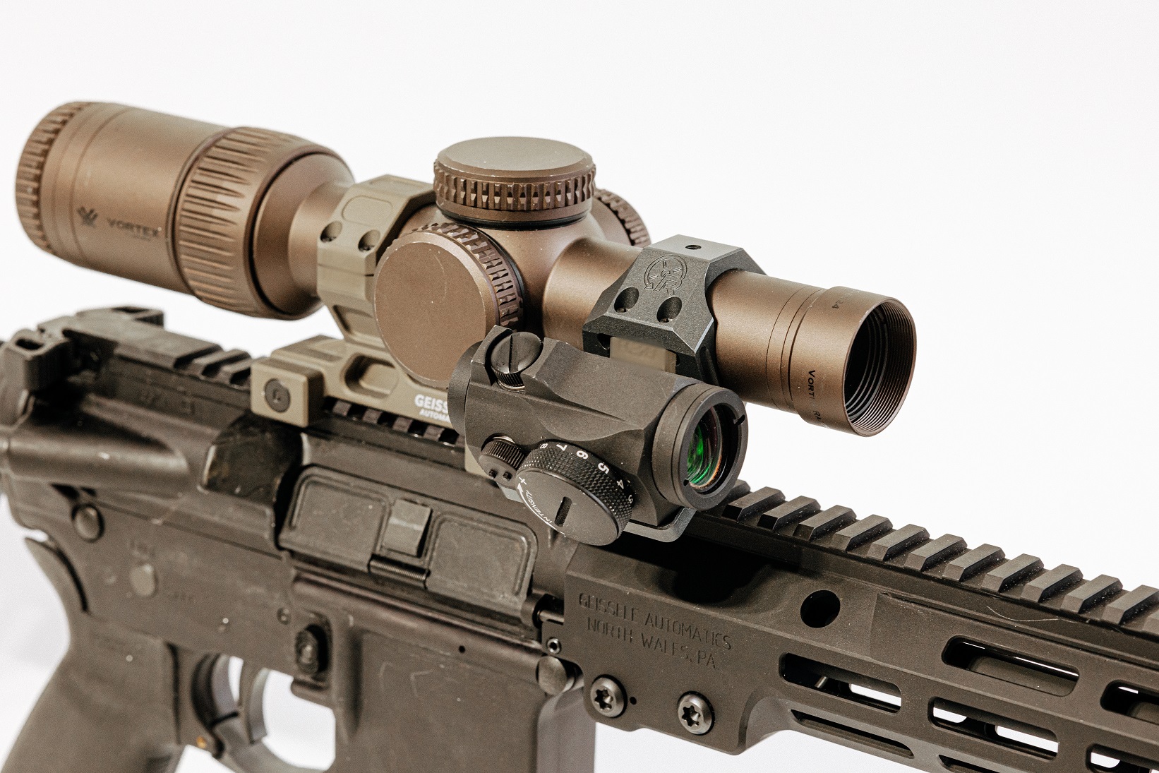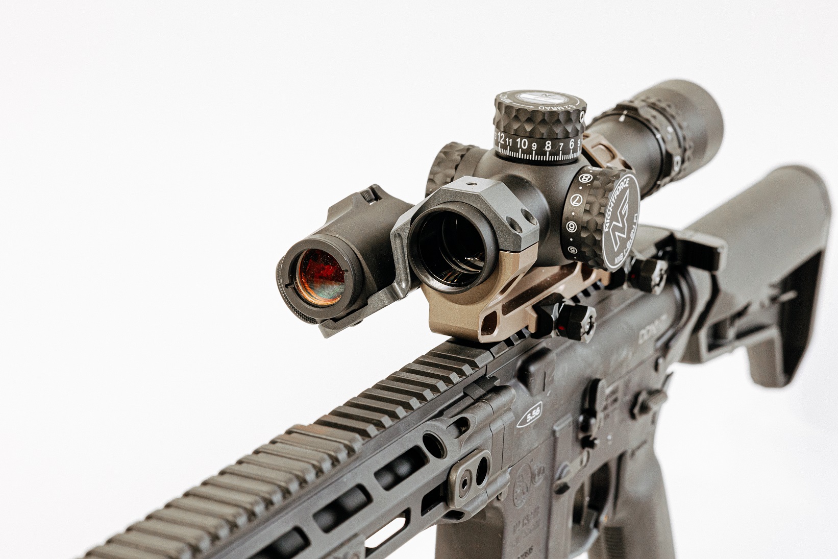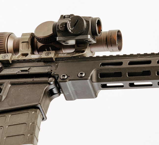 A30, the first model in the new line of ambidextrous mounts replaces existing scope caps on Geissele’s Super Precision and Reptilia’s AUS 30mm mounts, with an Aimpoint Micro footprint.  The offset optic is placed at an optimized 34 degree angle like Rotapoint’s existing models, and keeps the offset optic mount off the handguard while offering consistent cheekweld.  To install, the user simply removes the existing scope cap and hooks the offset mount over the scope tube and secures it onto the base with the existing scope ring screws.  Depending on scope dimensions, the offset optic may be installed on the front or rear ring.
