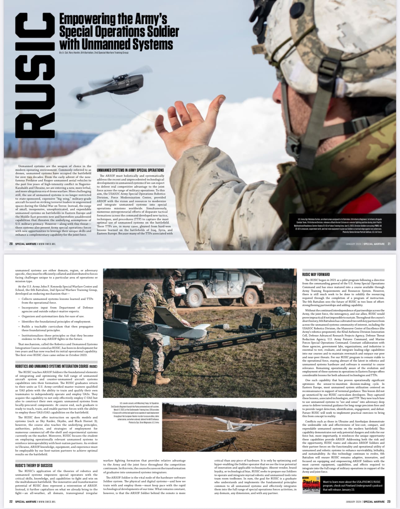 While no MOS name has been mentioned, it may likely be “Robotics and Unmanned Systems Technician”. This guess is based upon the six week Robotics and Unmanned Systems Integrator Course currently taught as an advanced skill to select SOF at USAJFKSWCS. However, SOF leaders have widely acknowledged that other, emerging technologies are required by their forces.
