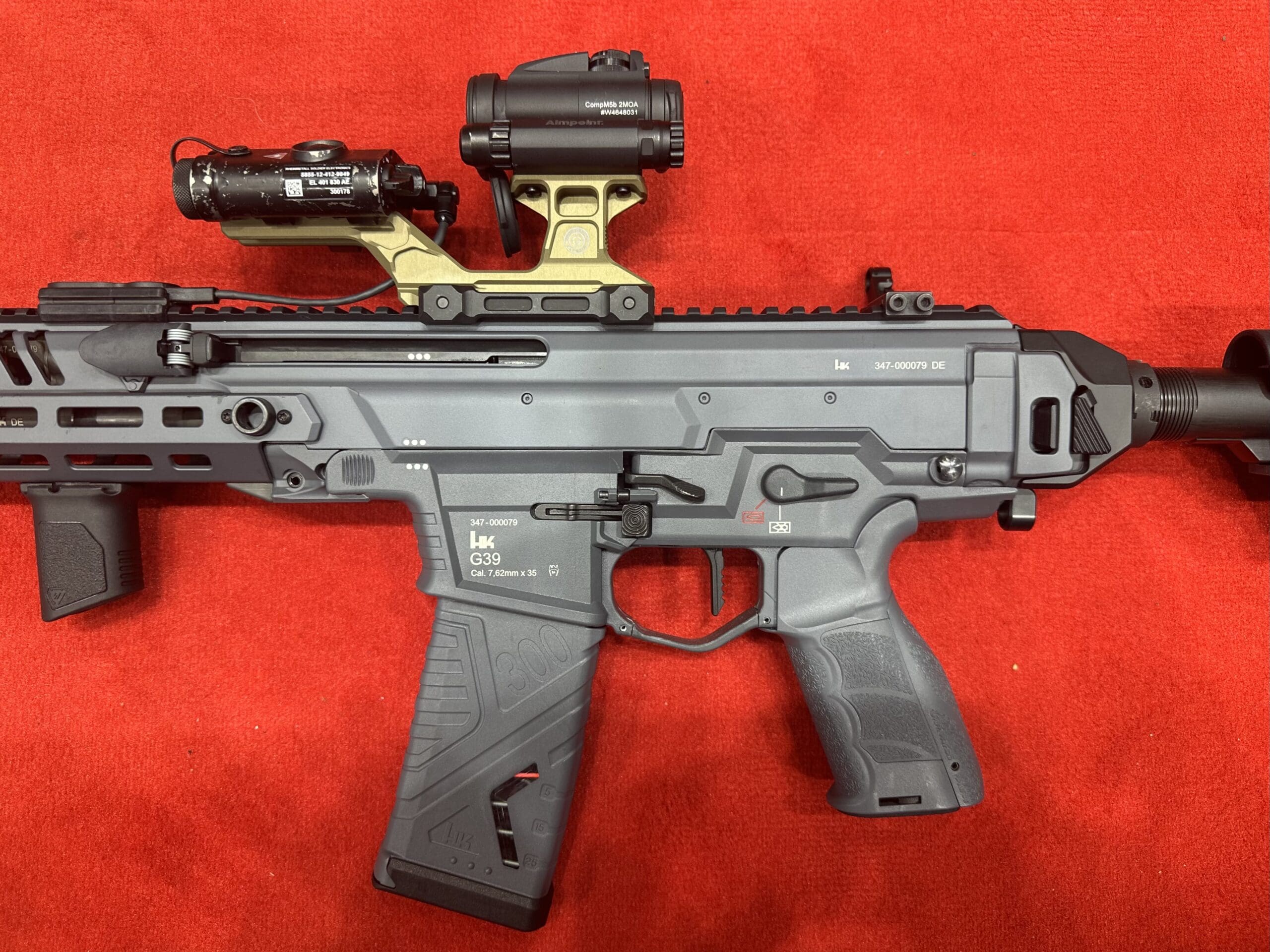 Heckler & Koch is exhibiting the HK G39 in 7.62 x 35mm (300 BLK) which is based on the 437 platform. It features a 9″ barrel, but 7″ barrels are also available.