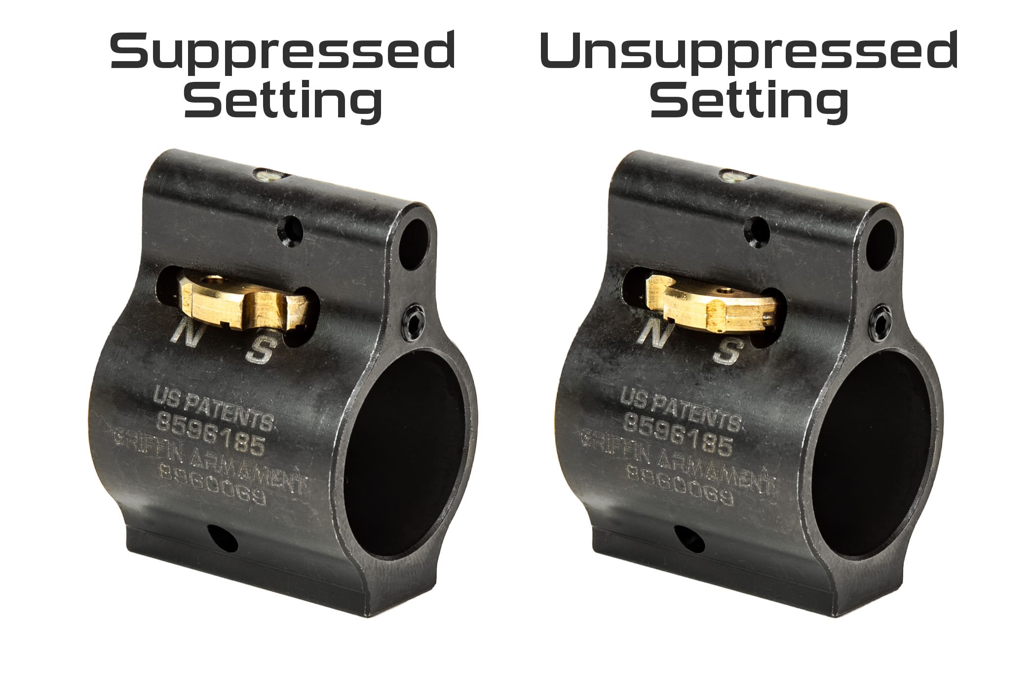 It has long been Griffin Armament’s belief that the ideal AR-15 should have 2 simple modes – Normal and Suppressed – affording a K.I.S.S. concept optimization for use with and without suppressors, easily adjustable by tool-less means or with a tool any sportshooter or rifleman has such as a round of 5.56mm ammunition which is already used for example to remove the firing pin retaining pin from the bolt. The Griffin Adjustable AR-15 Gas Block achieves this simplicity and is a product made possible by the acquisition of two patents from MicroMoa LLC – the original manufacturers of the “Govnah gas block”.
