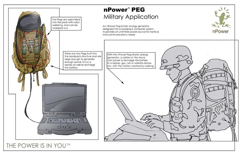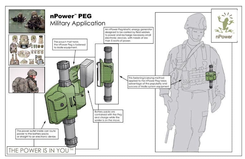 Developed by Tremont Electric based in Cleveland, Ohio the nPower Personal Energy Generator (PEG) is very lightweight, ultra rugged, and completely silent. The PEG weighs a mere nine ounces packed into a nine inch long cylinder that harvests kinetic energy from the human stride and turns it into 2.5 watts of electricity.